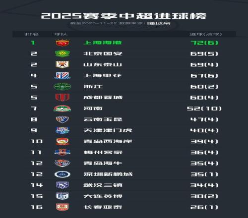 2025赛季中超进球榜: