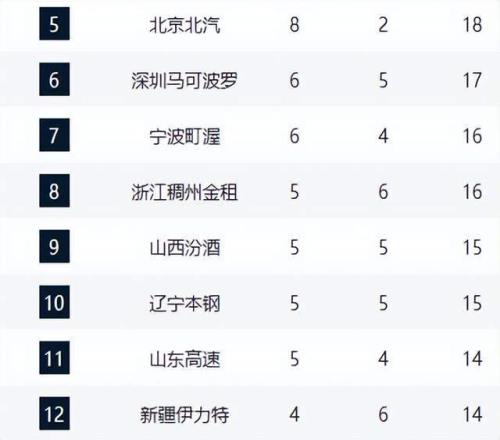 积分榜中游,深圳队6胜5负升至第六,宁波队6胜4负少赛一轮暂列第七。浙江队经历赛季初低迷后渐入佳境,本轮爆冷绝杀广东队,战绩变为5胜6负,排名升至第八。辽宁队作为四冠王,排名下滑至第十,战绩5胜5负,状态亟待调整。