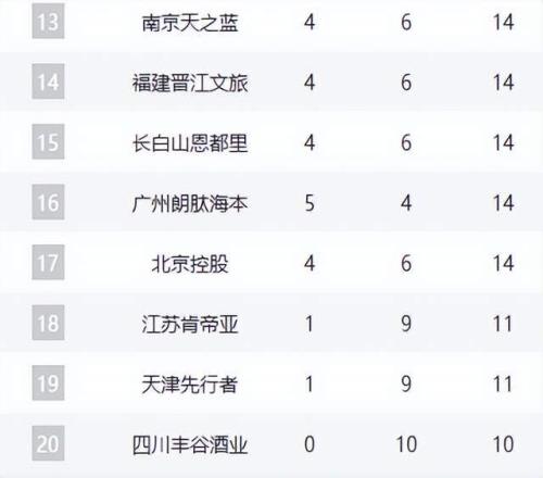 积分榜后半段,山东队少赛两轮暂列第11,新疆队4胜6负守住季后赛守门员位置。同曦、福建、吉林三队战绩同为4胜6负,竞争激烈。广州队5胜4负位列第十六,北控、江苏、天津、四川等队排名靠后,其中四川队遭遇10连败,一胜难求,继续垫底。